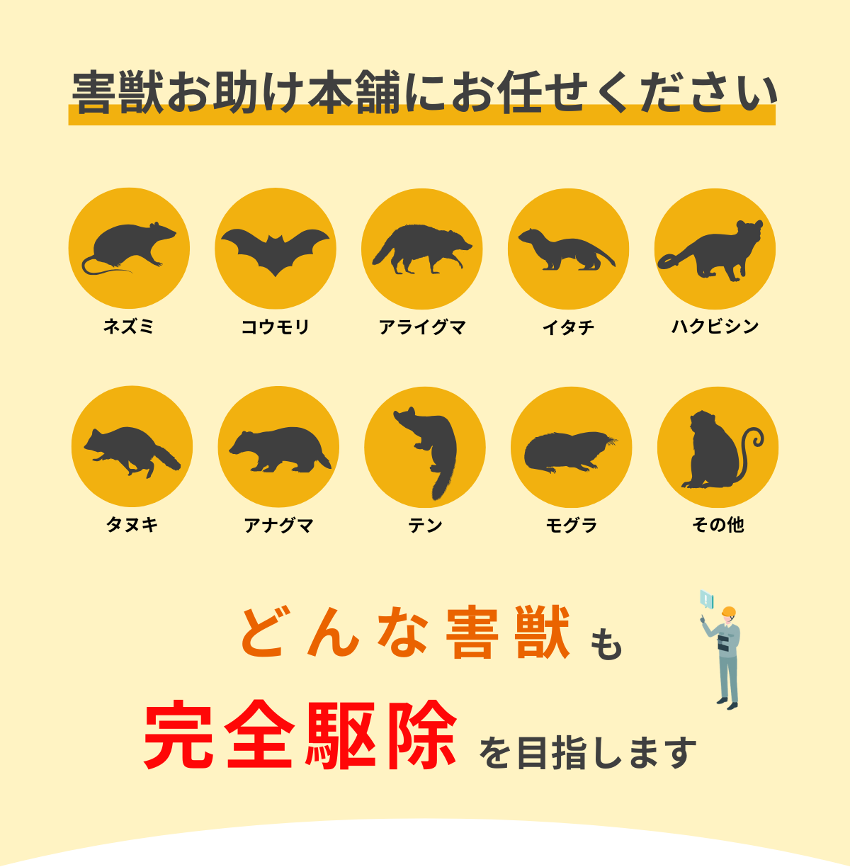 \事前見積もり無料/ 害獣駆除は日本全国対応※沖縄、離島は除く \24時間365日受付中/