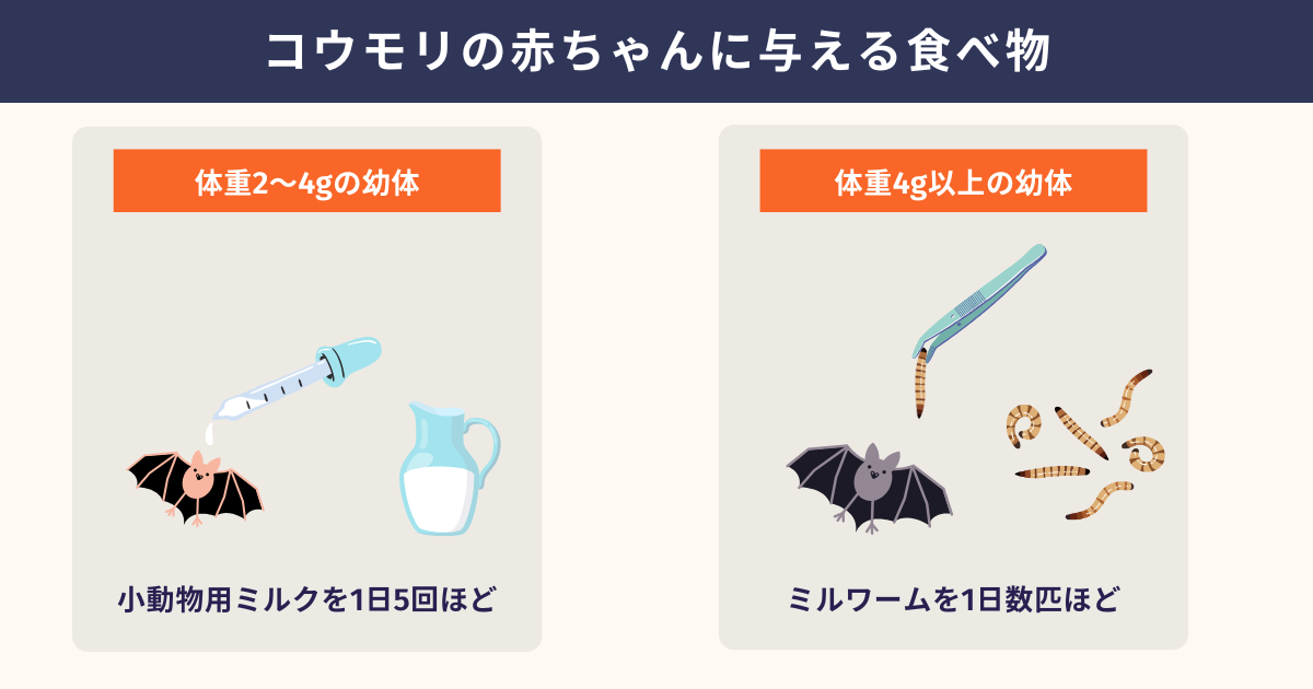 コウモリの主食は昆虫ですが、赤ちゃんの場合は成長度合によって食べ物が変わります。