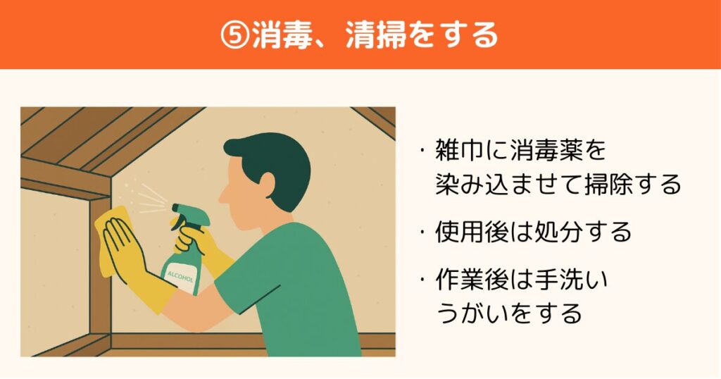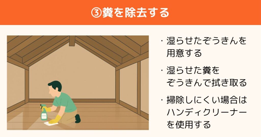 個人で対応する場合は、必ず糞を湿らせて粉じんが舞わないようにし、丁寧に拭き取るなど正しい手順で行うことが重要です。