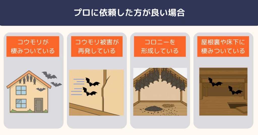 また、コウモリが家に棲みついている、被害が拡大しているなどのケースも、プロの駆除業者へ依頼するのが安全です。