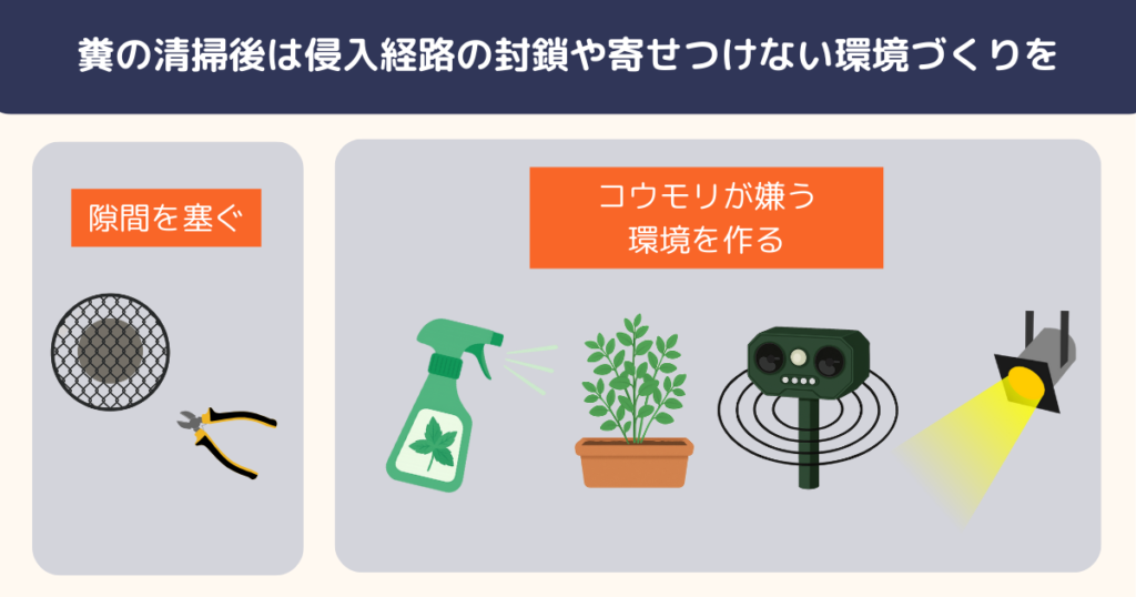 侵入経路の封鎖後に嫌がる環境をつくり、二度とコウモリの糞尿被害に悩まないようにしましょう。