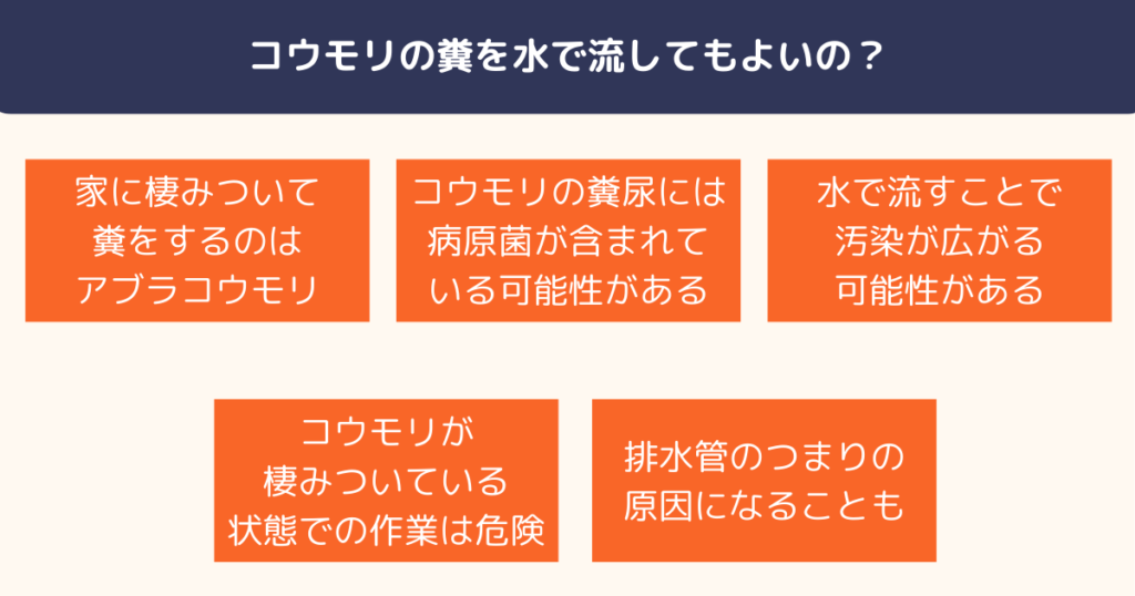 コウモリの糞には細菌や寄生虫などの病原菌が含まれており、水で流すことで汚染が広範囲に広がってしまう恐れがあるためおすすめできません。
