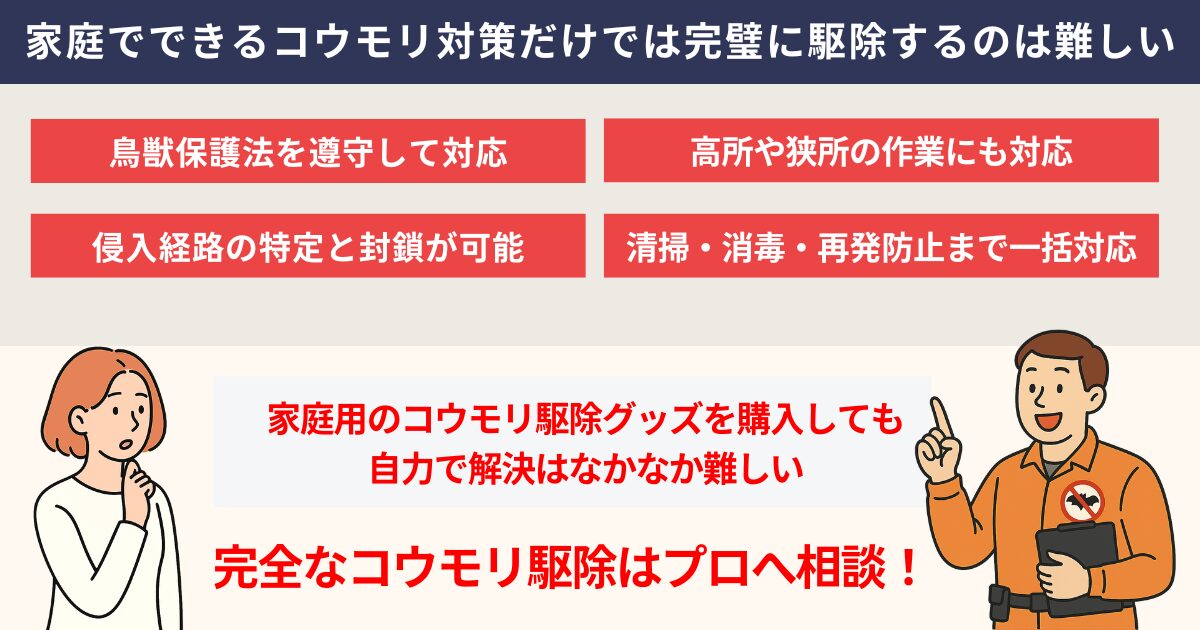 家庭でできるコウモリ対策は、身近なアイテムや工夫で手軽に始められる一方で、完全に駆除するのは難しいです。