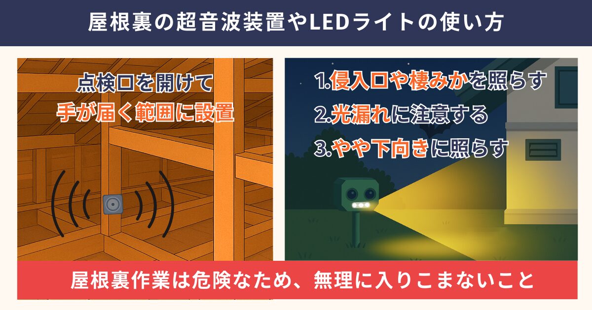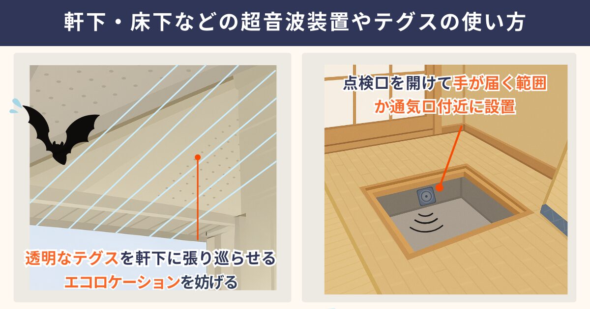 暗い通気空間には、コウモリが嫌う超音波装置を設置すると有効です。