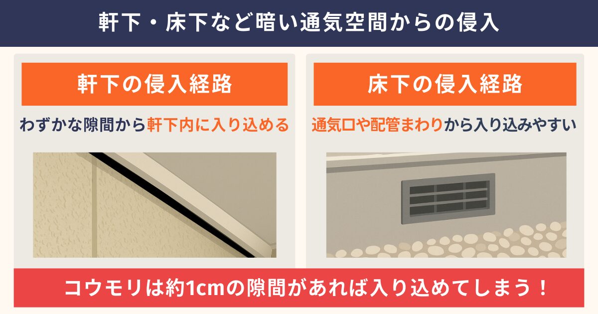 軒下や床下は暗く外からも見つかりにくいため、コウモリが棲みかにしやすい場所です。