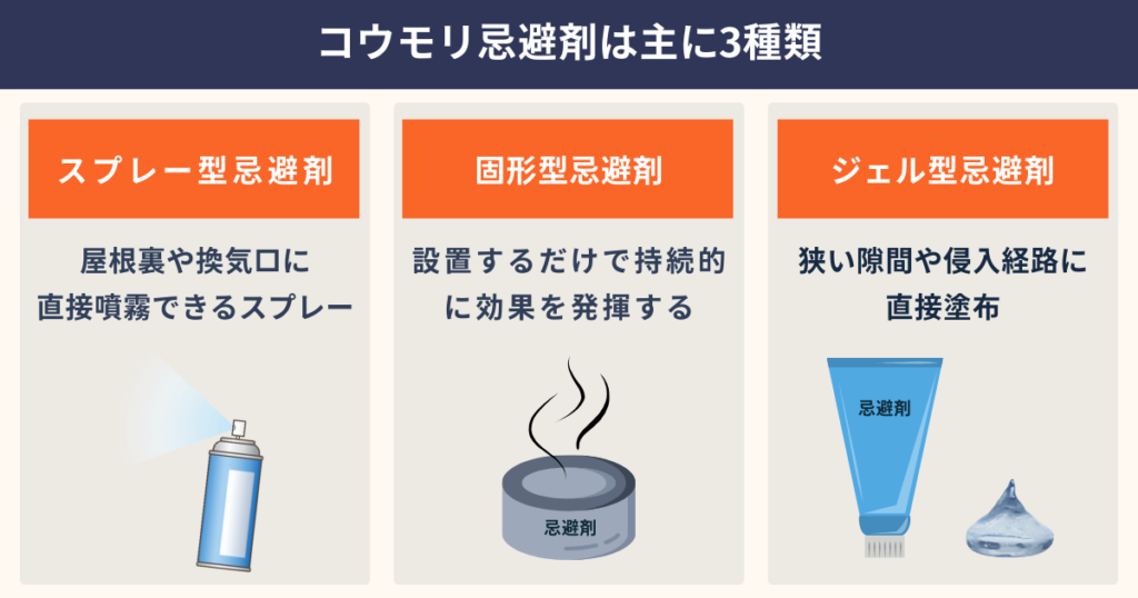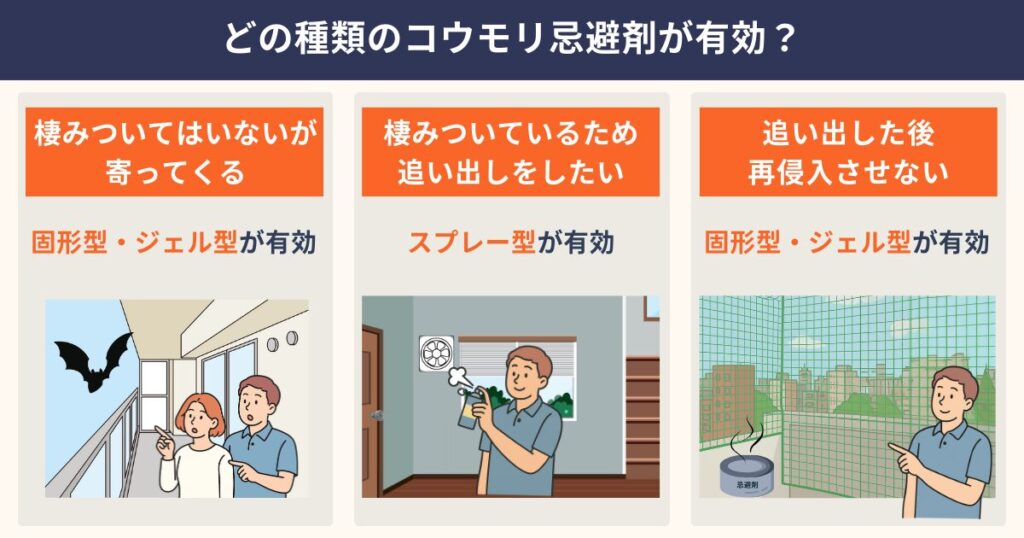 コウモリ忌避剤は種類によって効果を発揮しやすい場面が異なります。