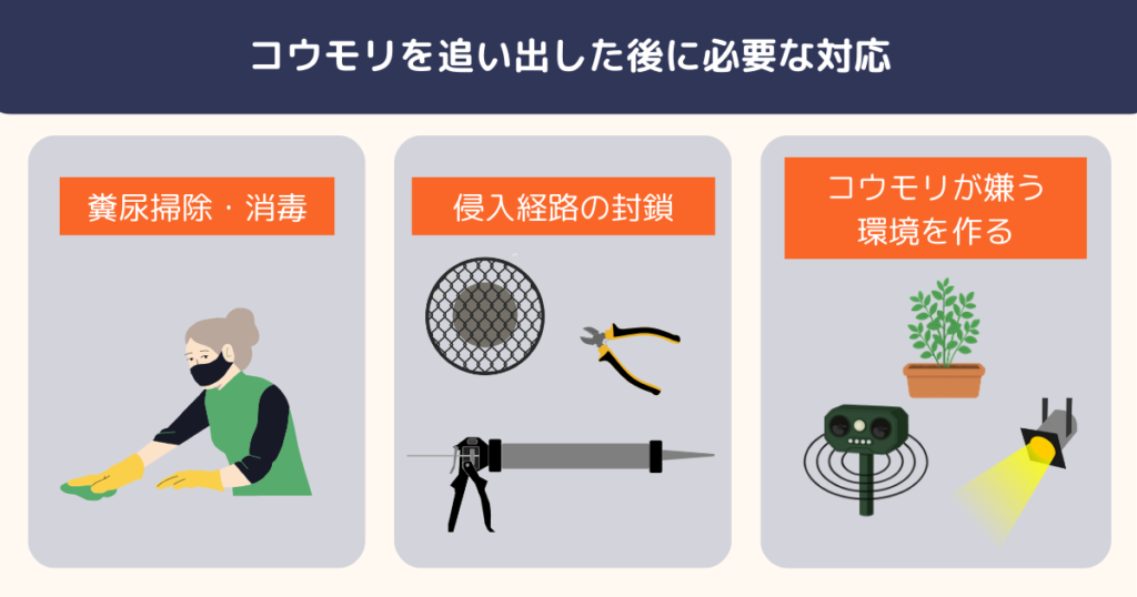 また、追い出した後にすき間や通気口を塞ぎ、再侵入を防止することも重要です。