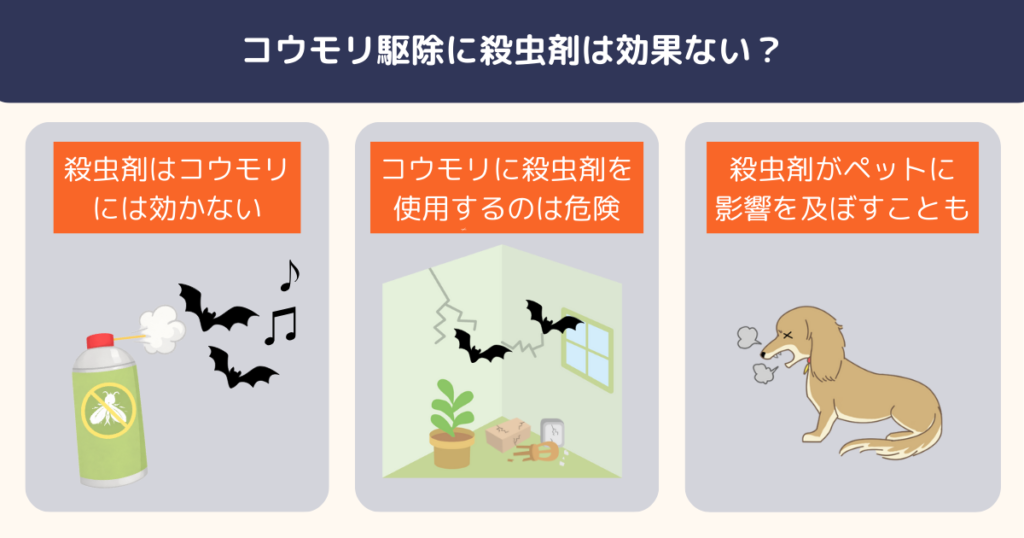 コウモリに対して「殺虫剤を使えば追い払えるのでは?」と考える方もいるかもしれません。