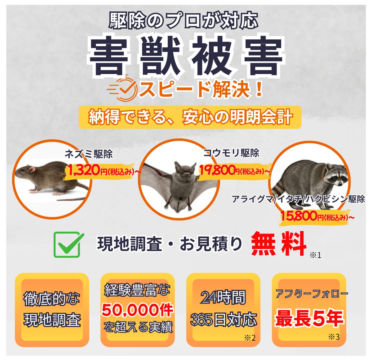 \事前見積もり無料/ 害獣駆除は日本全国対応※沖縄、離島は除く \24時間365日受付中/