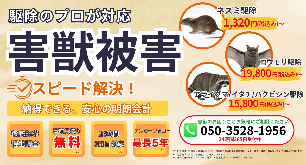 \事前見積もり無料/ 害獣駆除は日本全国対応※沖縄、離島は除く \24時間365日受付中/