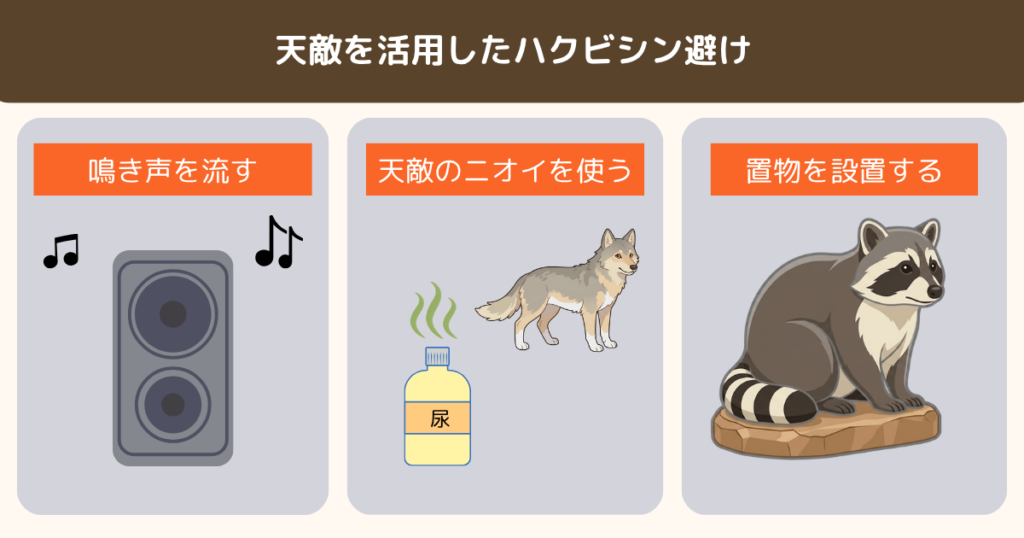 天敵の鳴き声やニオイ、置物を活用した対策もありますが、ハクビシンは環境への適応力が高く、被害を完全に防ぐのは困難です。