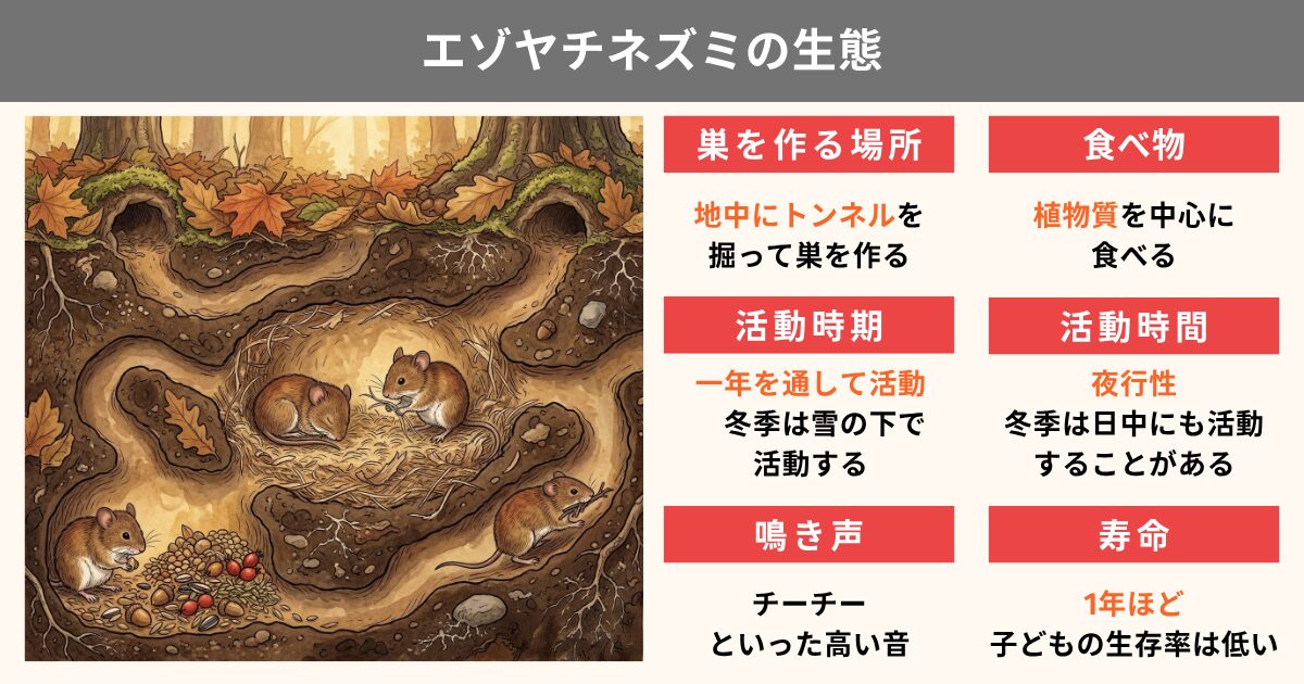 エゾヤチネズミは地面を中心に活動するネズミで、落ち葉の下や土の中にトンネルを作りながら生活しています。