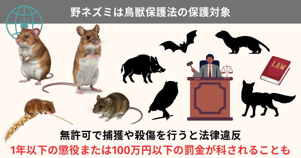 多くの野ネズミは鳥獣保護法の対象で、無許可での捕獲や駆除は禁止されています。