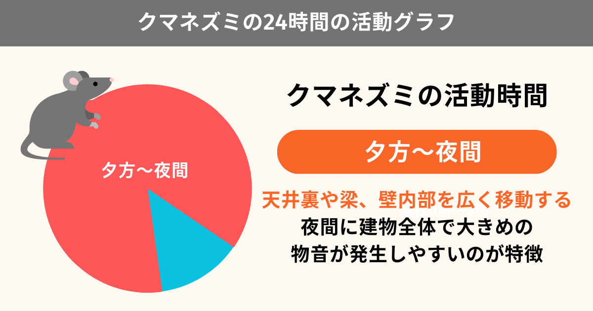 クマネズミは夜行性で、夕方から夜間にかけて活動が集中します。