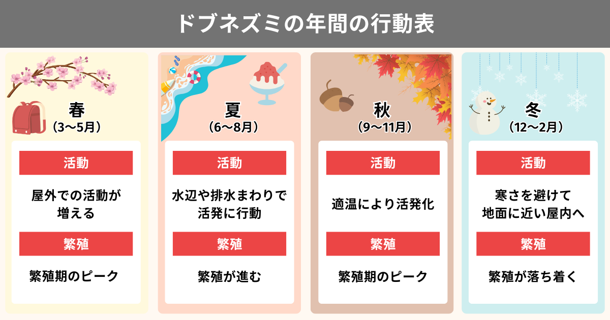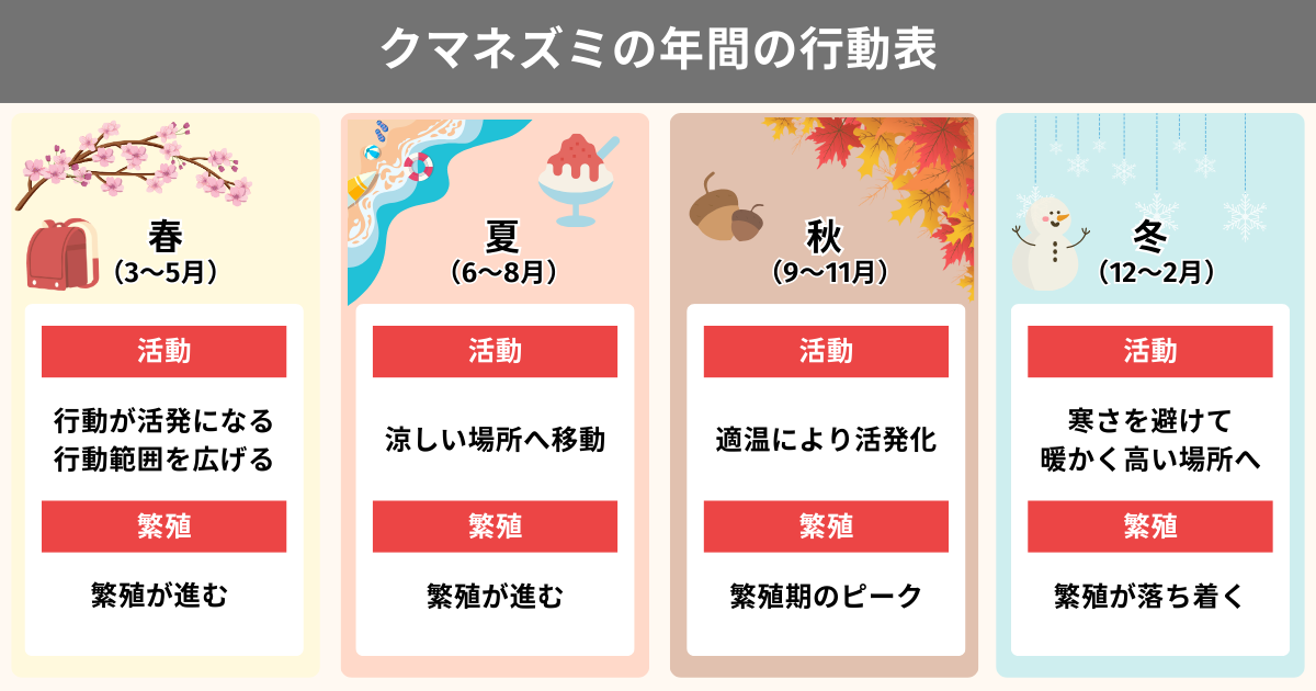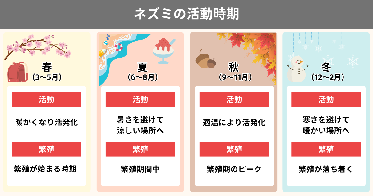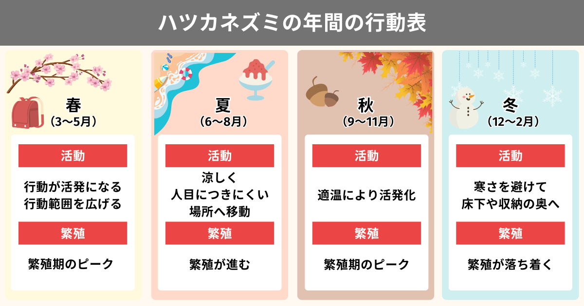 ネズミは1年を通して活動していますが、春夏秋冬で行動が変化するという特徴があります。