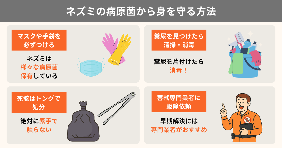 一時的な対策でネズミの姿が見えなくなっても、糞尿による汚染や菌が残ったままでは、感染リスクが解消されたとはいえません。