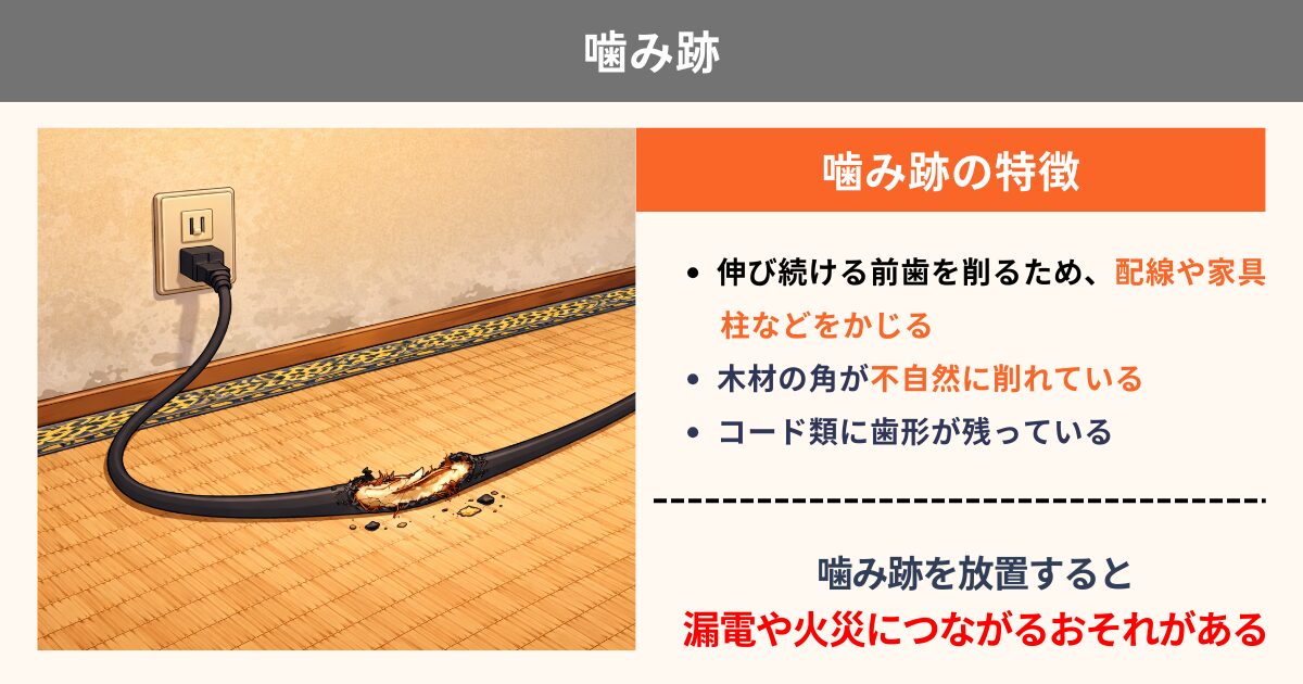 噛み跡を放置すると、漏電や火災につながるおそれもあるため、早めの対策が必要です。