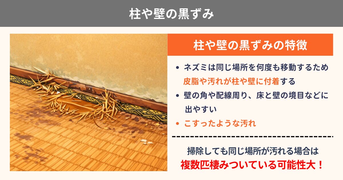 ネズミは同じ場所を何度も移動するため、体毛についた皮脂や汚れが柱や壁に付着し、黒ずみとして残ることがあります。