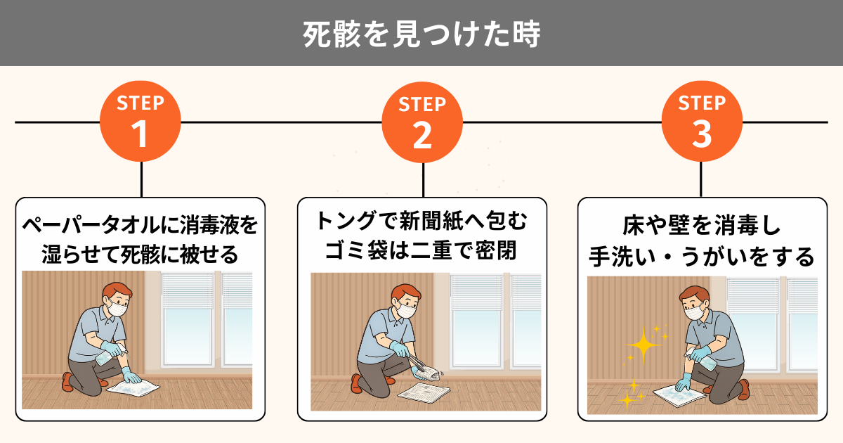 駆除後は必ず手袋を着用し、死骸を速やかに回収したうえで、周囲を丁寧に清掃・消毒してください。
