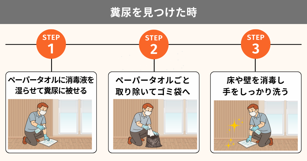 糞尿やホコリが舞い上がると、体に入ることもあるため、放置は危険です。