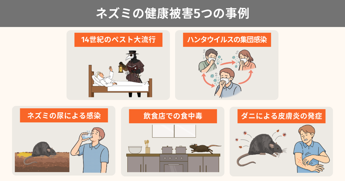 過去にはネズミが関与したペスト(黒死病)の大流行があり、近年においてもレプトスピラ症の感染例や、ネズミ由来のダニによる皮膚炎など、身近な環境で起きた健康被害が多数報告されています。