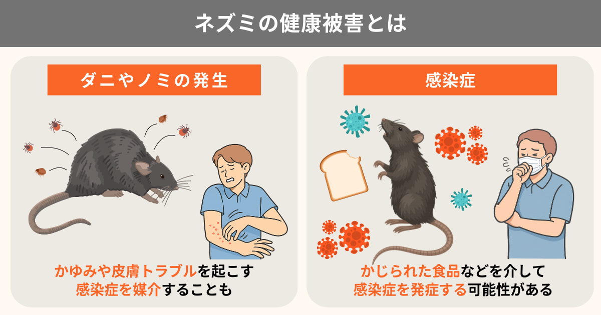 ネズミは、病原体や寄生虫を介して人の健康に影響を及ぼすことがあり、気づかないうちに体調不良や感染症につながることがあります。