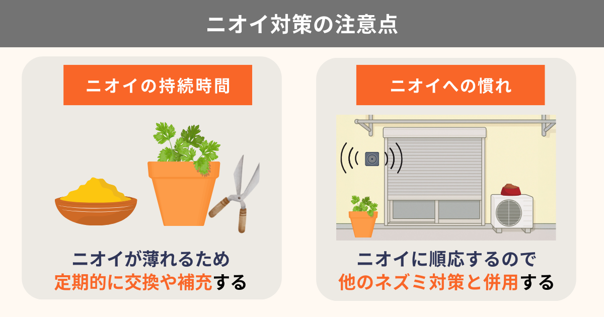 一方でニオイ対策だけでは、すでに棲みついている個体の完全な追い出しや繁殖の抑制は難しいのが実情です。