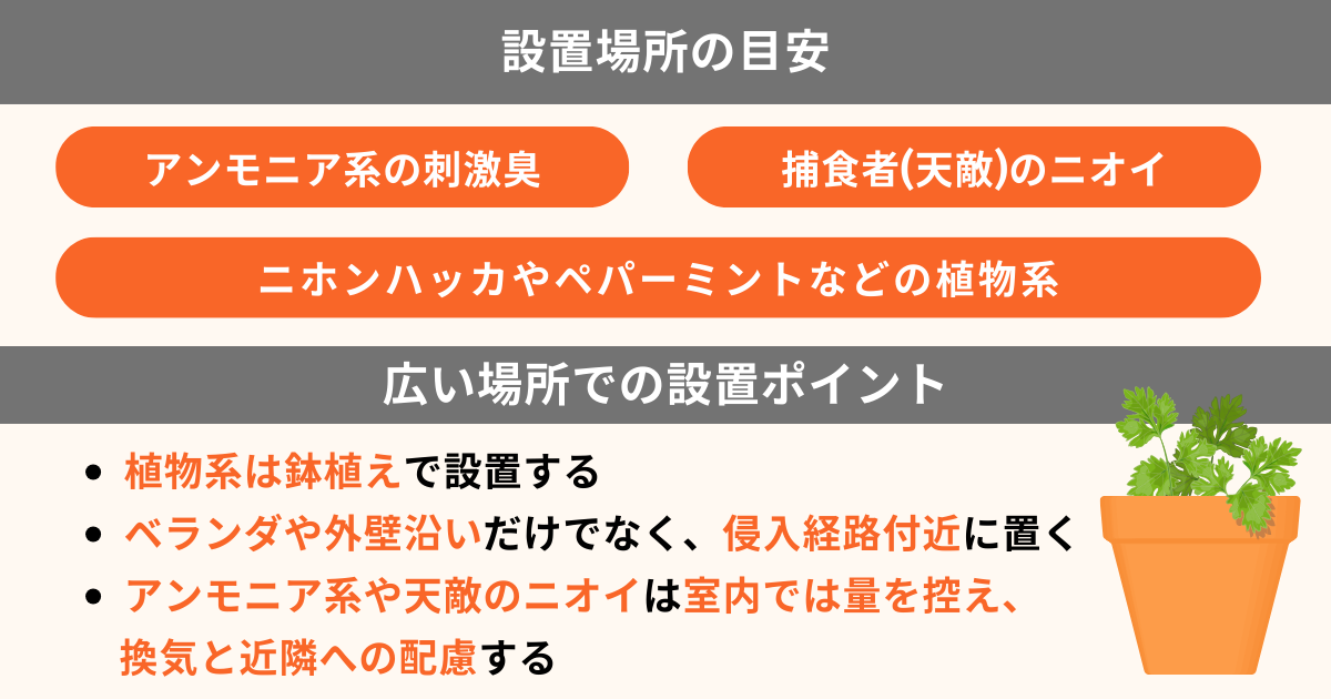 - 通り道や侵入経路を避けさせる環境づくりに有効