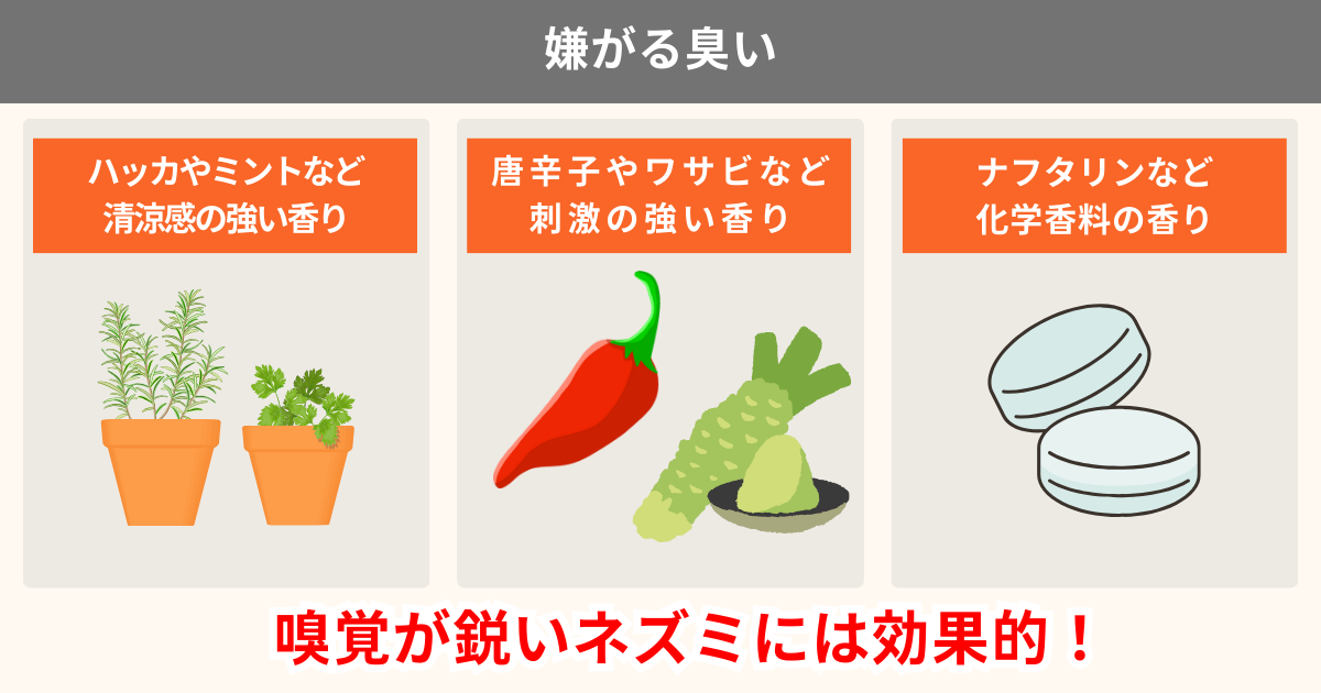 - ネズミが嫌うニオイで近づきにくくする