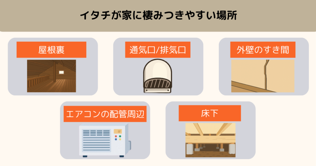 屋根裏や床下、物置などは人目につきにくく、外敵から襲われにくいため、イタチにとって安全な空間です。