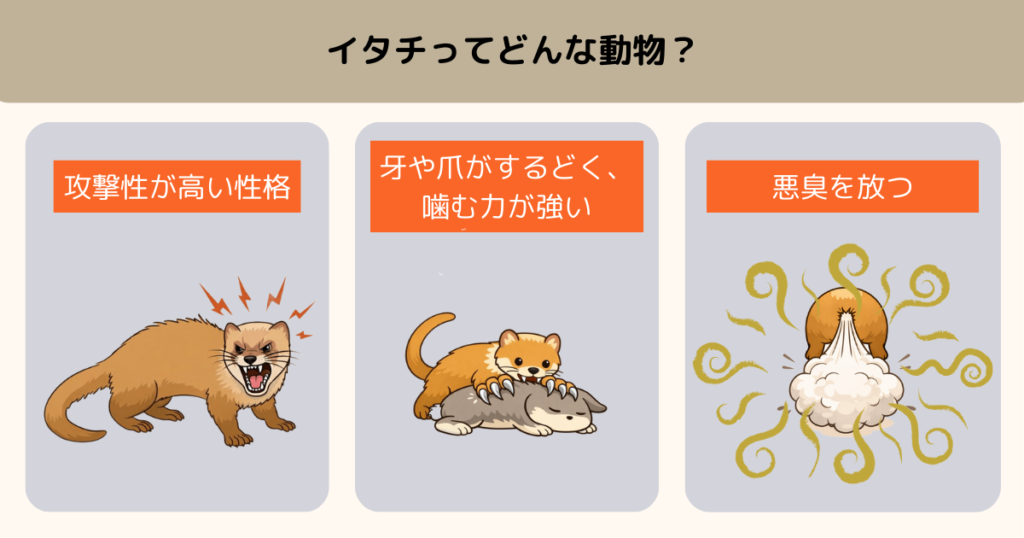 見た目の可愛らしさからは少し想像しづらいですが、イタチは攻撃性の高い好戦的な性格です。
