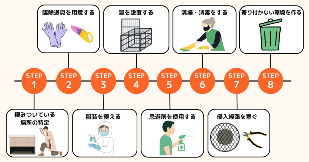不要な物は整理する、雑草は刈る、食べ物はためない、定期的に清掃するなどを徹底することで、寄りつきにくい環境を作れます。