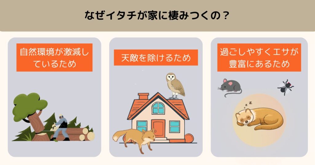 イタチが住宅へ侵入して棲みつく主な理由を解説します。
