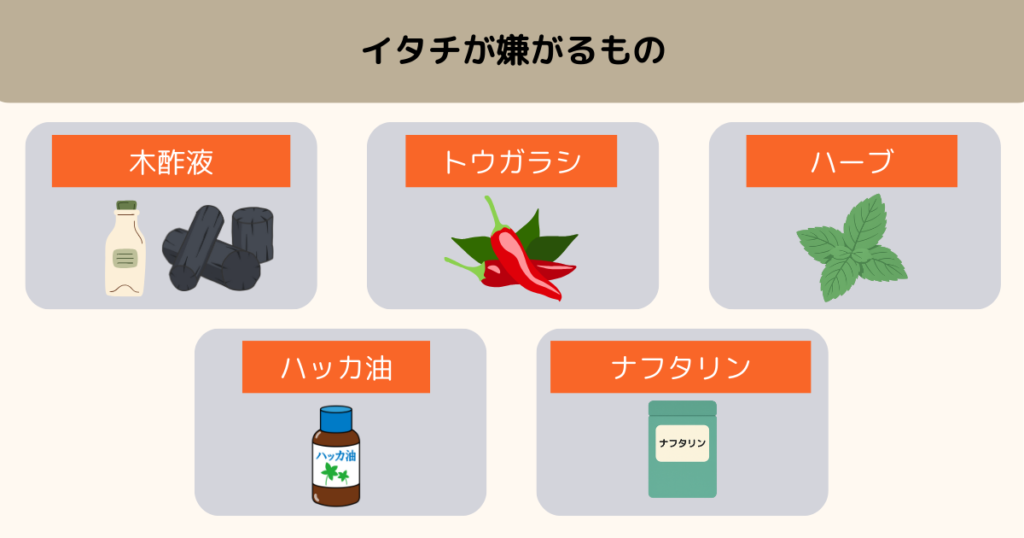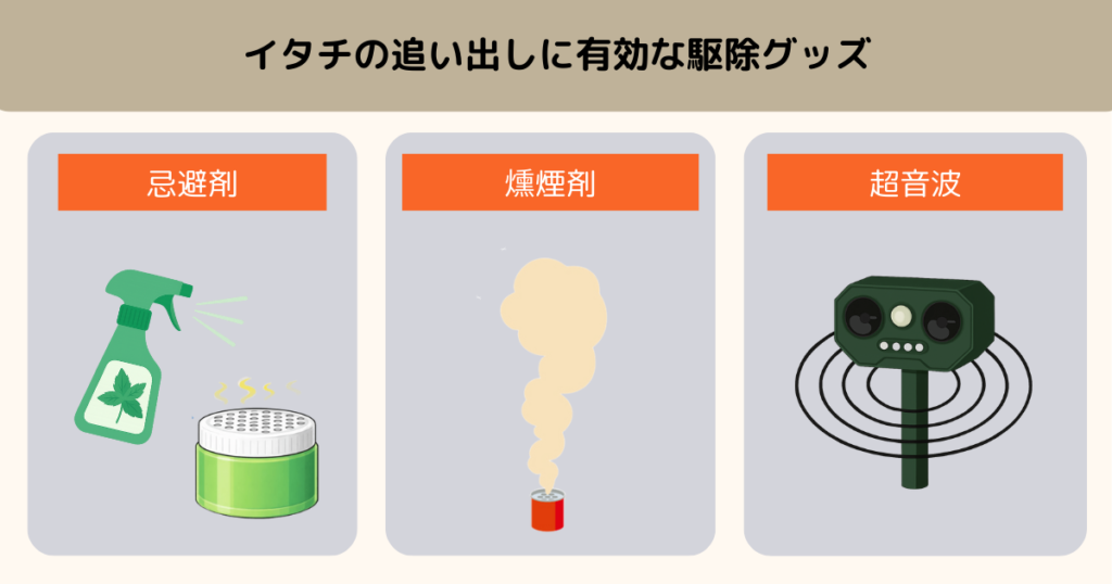 イタチが嫌がるハッカ油や木酢液などを含んだ忌避剤を使用して追い出します。
