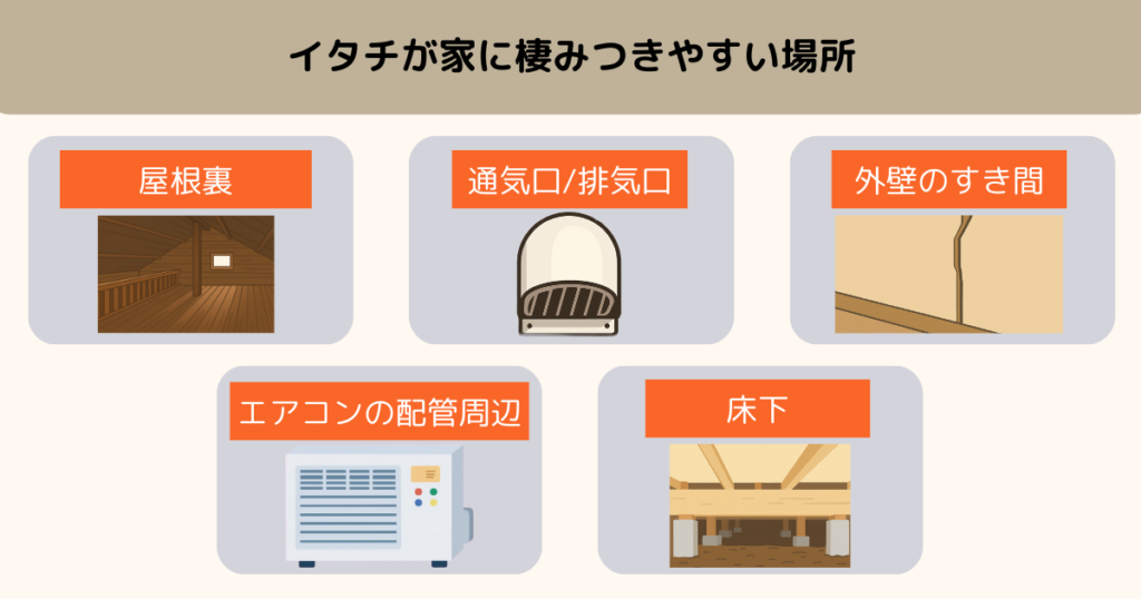 屋根裏や床下、物置は安全で人目につきにくいため、棲み処として最適です。