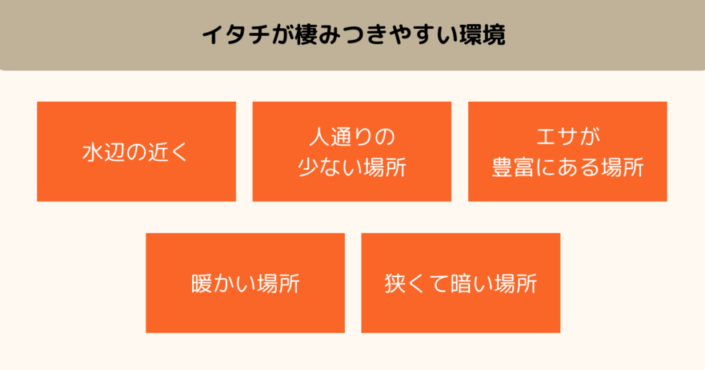 また、ネズミや昆虫といったイタチの捕食対象や生ごみも豊富にあるため、エサに困らないのも棲みつく原因になります。