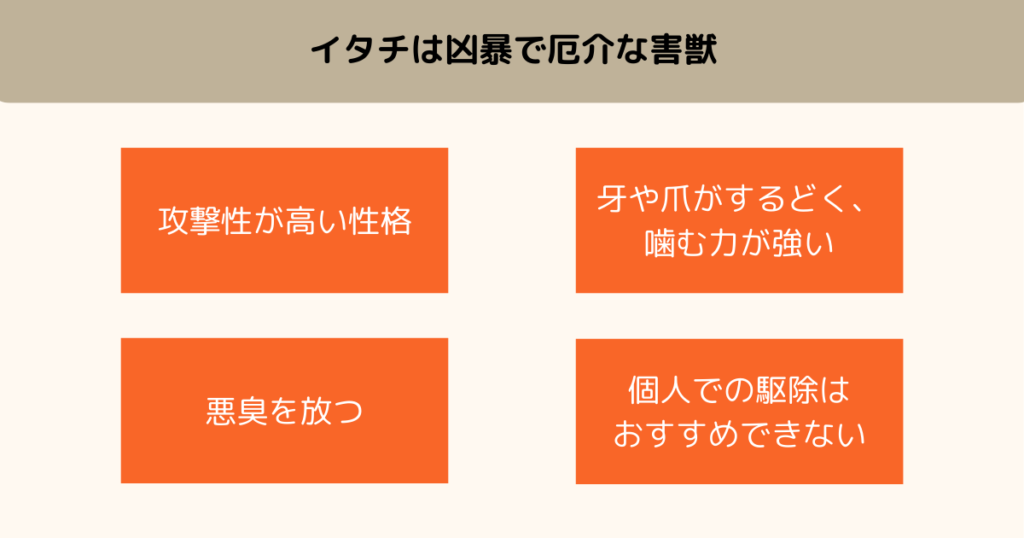 イタチは攻撃的な性格なので、噛まれたり引っかかれたりする恐れや、糞尿や体から病原菌を媒介する可能性も。