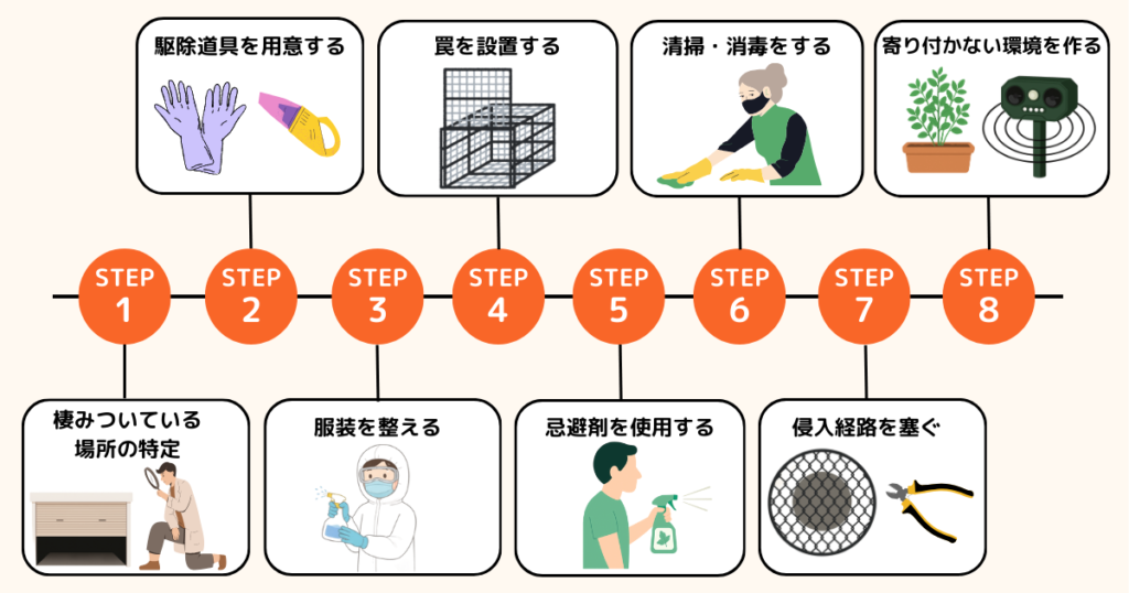 追い出しや衛生対策、侵入経路封鎖に適した道具をそろえます。