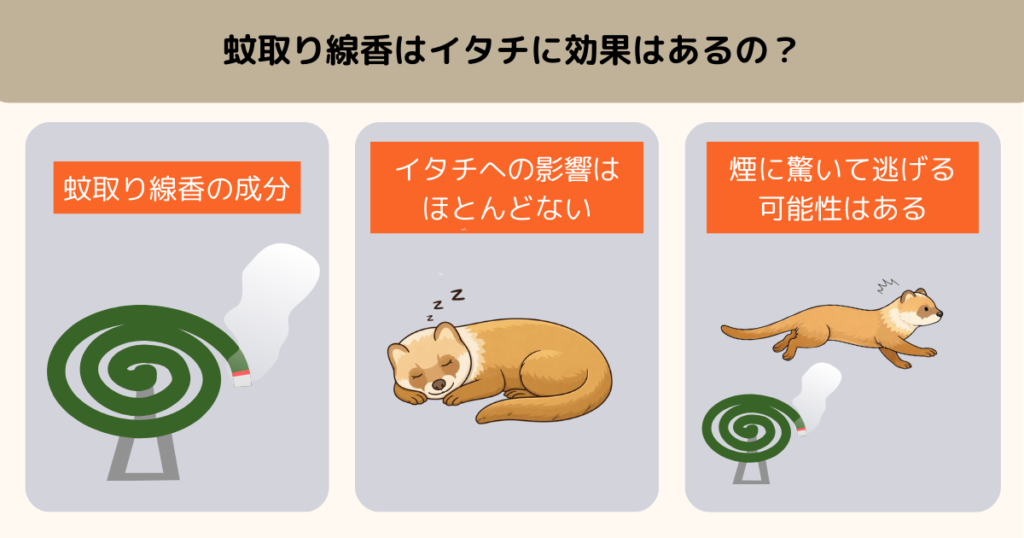 蚊取り線香は、蚊を駆除するための道具であり、イタチのような哺乳類には作用しません。